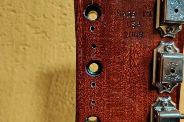 Гитара в довольно хорошем состоянии, протёрт лак на задней части корпуса, подклеена трещинка в месте крепления колков.
