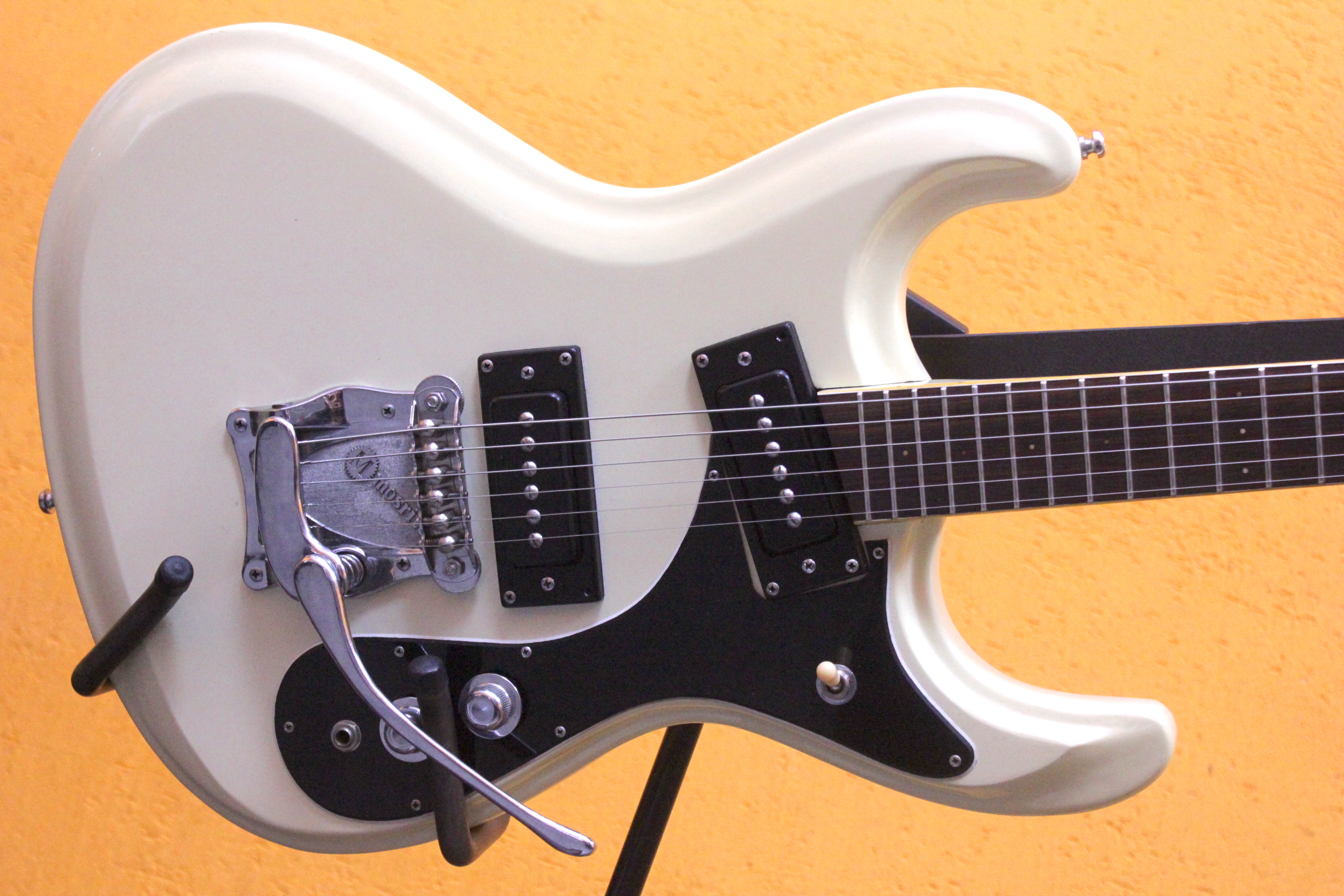 Тщательно повторены все детали — и необычные датчики, напоминающие P90, и бигсби-подобное вибрато, и, конечно, замысловатая ретро-форма, сразу навевающая мысли о рок-н-рольных дайнерах и океанском прибое.