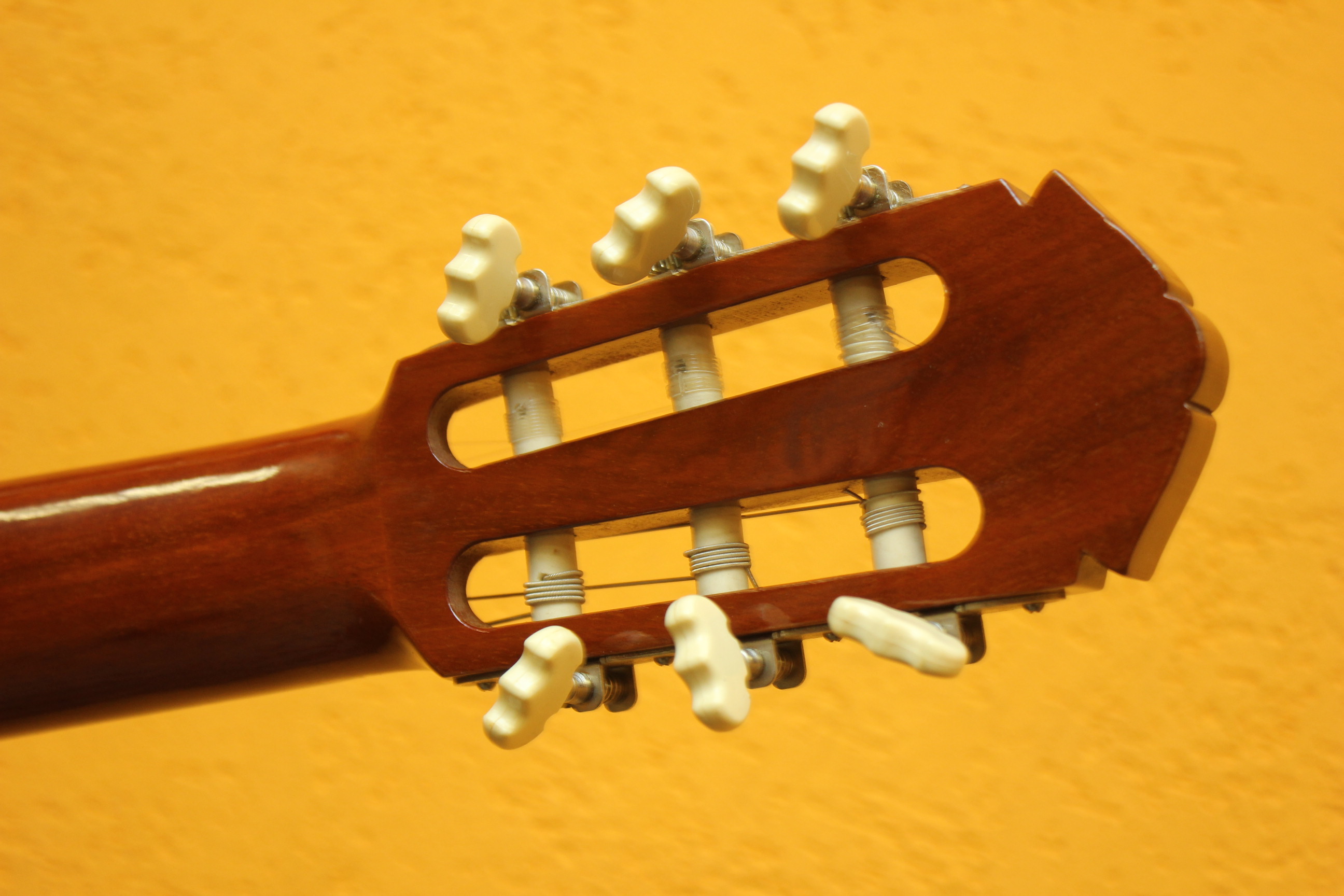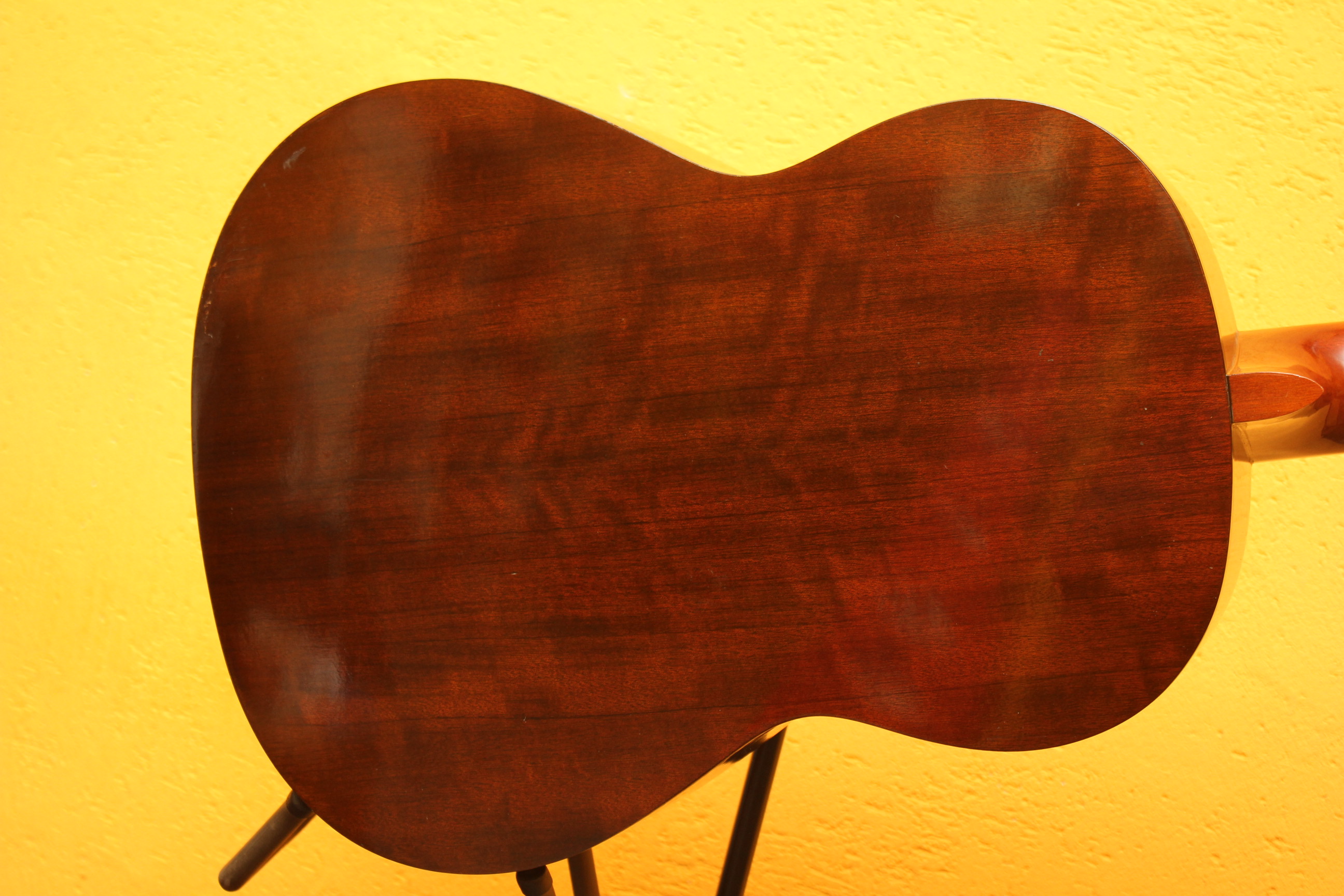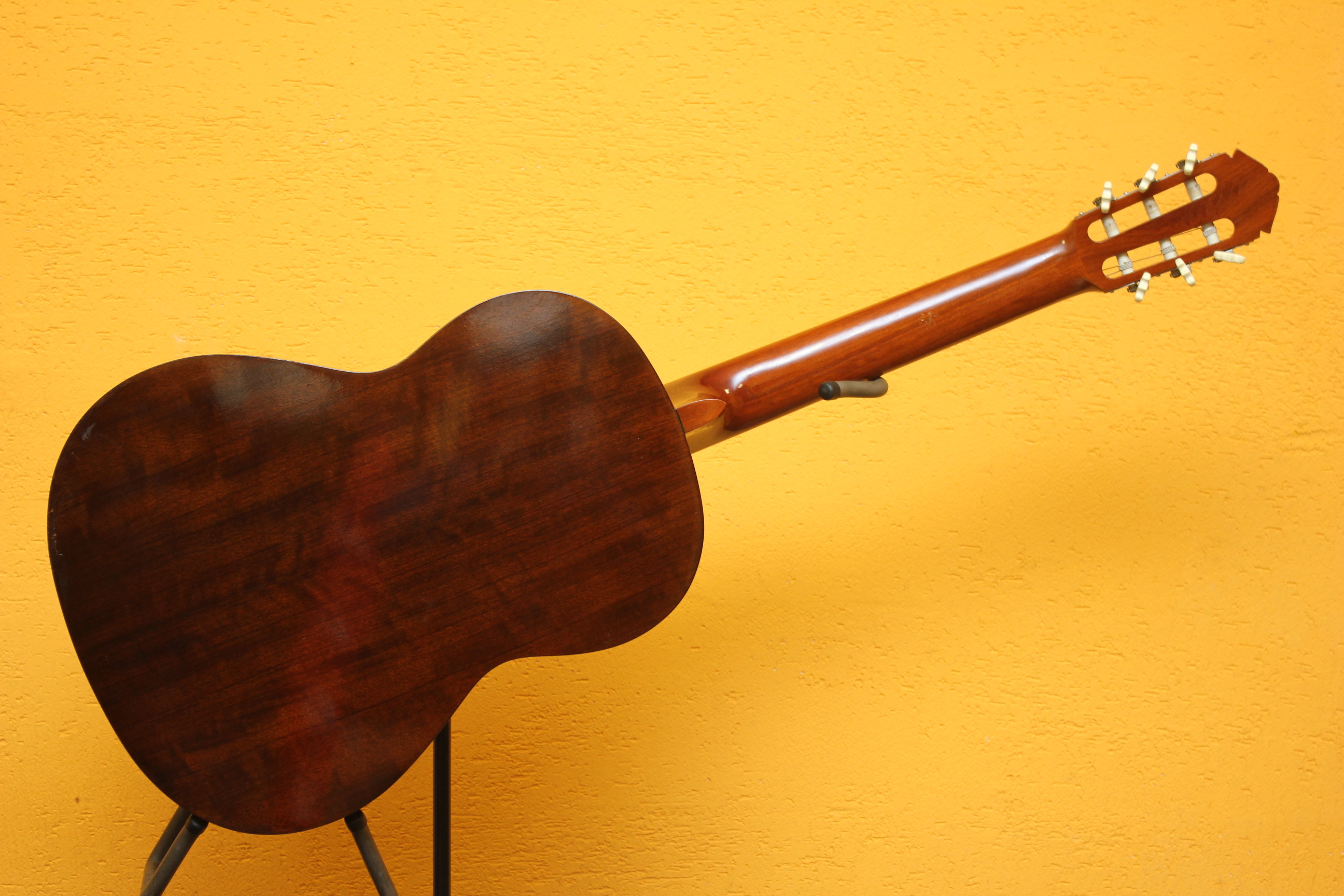 Отличная японская классическая гитара. Верхняя дека гитары изготовлена из древесины ели, гриф из древесины нато с традиционной накладкой из палисандровой древесины. Совокупность таких материалов придает инструменту более яркое, глубокое и сбалансированное звучание с приятными обертонами. Гитара в неплохом состоянии, из минусов — царапина на грифе, след от удара на задней деке.